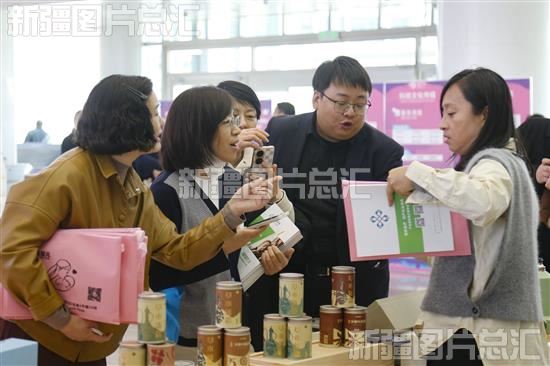2023年11月8日,在乌鲁木齐经济技术开发区(头屯河区)的新疆软件园创智大厦一楼,一些驻区企业在活动现场,推介着各自的产品。