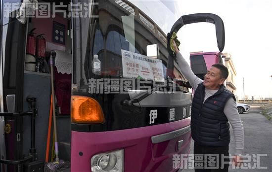 2023年11月10日,阿拉木图国际道路(旅游)班车司机擦拭班车。都拉塔口岸国际汽车客运站于今年8月1日正式运营。