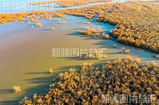 俯瞰呼图壁县小海子湿地,芦苇、红柳等各类植被披上“金装”,水鸟觅食嬉戏,一幅生态美景映入眼帘,美不胜收(2023年11月15日无人机摄)。