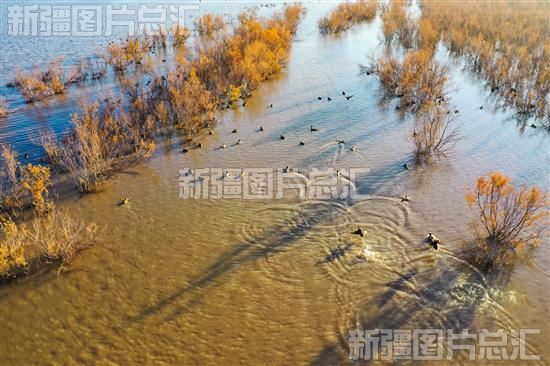 俯瞰呼图壁县小海子湿地,芦苇、红柳等各类植被披上“金装”,水鸟觅食嬉戏,一幅生态美景映入眼帘,美不胜收(2023年11月15日无人机摄)。
