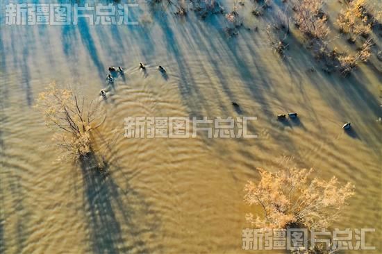 俯瞰呼图壁县小海子湿地,芦苇、红柳等各类植被披上“金装”,水鸟觅食嬉戏,一幅生态美景映入眼帘,美不胜收(2023年11月15日无人机摄)。