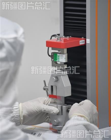 2023年11月15日,工作人员在新疆莱斯特包装材料有限公司生产车间检测产品质量。