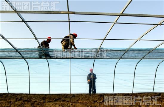 2023年11月15日,施工人员在位于和静县乃门莫敦镇包尔布呼村的兵地连村共建设施大棚惠民项目施工现场铺设大棚薄膜。