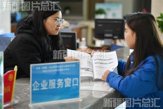 2023年11月15日,乌鲁木齐高新技术产业开发区(新市区)政务服务中心园区分中心工作人员为商家办理营业执照。