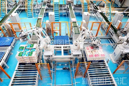 2023年11月15日,新疆天山面粉(集团)有限责任公司生产车间内,智能管控平台操纵智能机器人进行面粉生产和码垛。