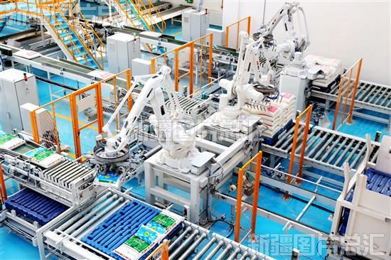 2023年11月15日,新疆天山面粉(集团)有限责任公司生产车间内,智能管控平台操纵智能机器人进行面粉生产和码垛。