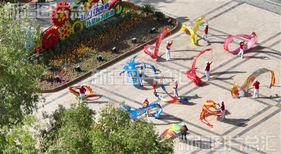 2023年4月28日,库尔勒市彩带龙健身爱好者聚集在人民广场,表演者们身着靓丽的服装,舞起手中的彩带龙迎接“五·一”国际劳动节,激发广大市民健身兴趣(无人机拍摄)。