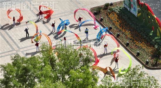 2023年4月28日,库尔勒市彩带龙健身爱好者聚集在人民广场,表演者们身着靓丽的服装,舞起手中的彩带龙迎接“五·一”国际劳动节,激发广大市民健身兴趣(无人机拍摄)。