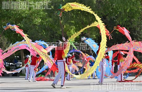 2023年4月28日,库尔勒市彩带龙健身爱好者聚集在人民广场,表演者们身着靓丽的服装,舞起手中的彩带龙迎接“五·一”国际劳动节,激发广大市民健身兴趣。