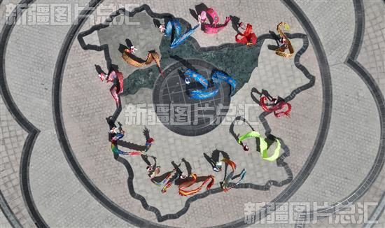 2023年4月28日,库尔勒市彩带龙健身爱好者聚集在人民广场,表演者们身着靓丽的服装,舞起手中的彩带龙迎接“五·一”国际劳动节,激发广大市民健身兴趣(无人机拍摄)。