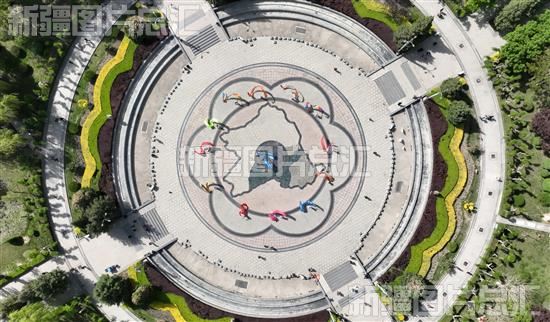 2023年4月28日,库尔勒市彩带龙健身爱好者聚集在人民广场,表演者们身着靓丽的服装,舞起手中的彩带龙迎接“五·一”国际劳动节,激发广大市民健身兴趣(无人机拍摄)。