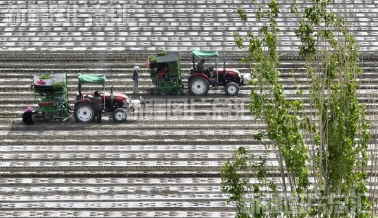 2023年4月20日,在焉耆回族自治县包尔海乡包尔海村田地,多台半自动、全自动辣椒移栽机进行移栽作业。