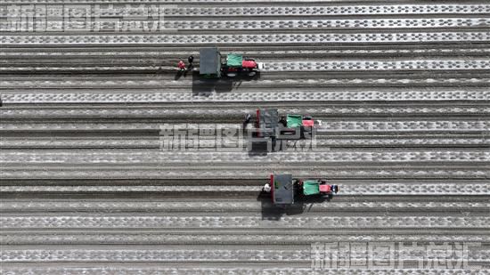 2023年4月20日,在焉耆回族自治县包尔海乡包尔海村田地,多台半自动、全自动辣椒移栽机进行移栽作业。