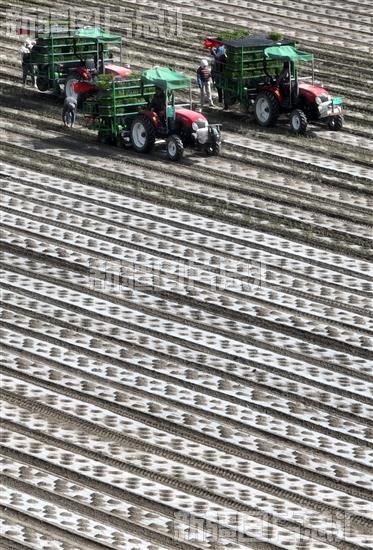 2023年4月20日,在焉耆回族自治县包尔海乡包尔海村田地,多台半自动、全自动辣椒移栽机进行移栽作业。