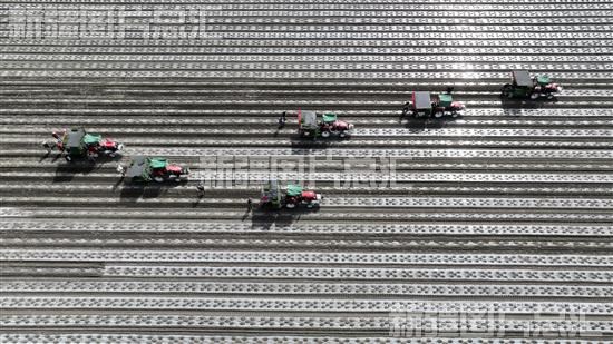 2023年4月20日,在焉耆回族自治县包尔海乡包尔海村田地,多台半自动、全自动辣椒移栽机进行移栽作业。