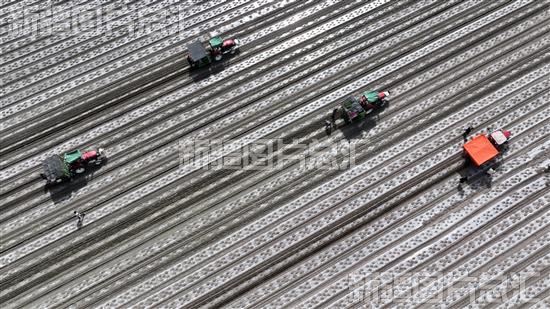 2023年4月20日,在焉耆回族自治县包尔海乡包尔海村田地,多台半自动、全自动辣椒移栽机进行移栽作业。