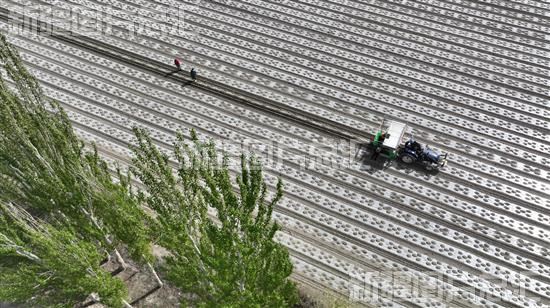 2023年4月20日,在焉耆回族自治县包尔海乡包尔海村田地,多台半自动、全自动辣椒移栽机进行移栽作业。