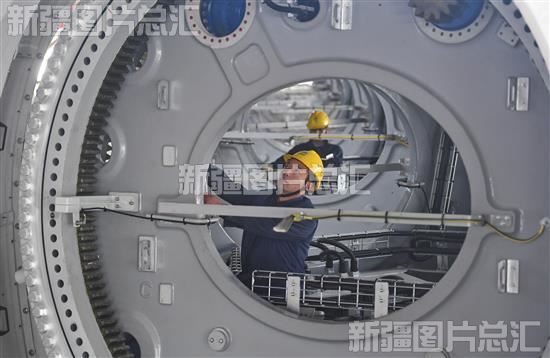 2023年4月25日,三一(塔城)风电设备有限公司员工在主轴生产线上工作。当日,三一重能风机主机和叶片制作项目基地在新疆塔城重点开发开放试验区先行发展区投产,项目总投资约3亿人民币,年产风力发电机组100万千瓦(5兆瓦机组200台),叶片600支,每年实现产能约20亿人民币。该项目不但填补了塔城当地风力资源丰富但无风机装备制造的空白,为塔城打造一个绿色低碳、高端制造的新能源产业装备制造基地,还将助力塔城重点开发开放试验区先行发展区成为立足疆内、面向中亚及欧洲的重要窗口。石榴云/新疆日报记者 汤永摄