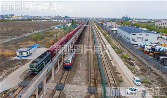 2023年4月10日,在霍尔果斯铁路(货运)口岸等待出境的中欧班列(无人机拍摄)。截至4月8日,霍尔果斯铁路口岸通行中欧(中亚)班列数量达2032列,比去年提前10天超过2000列大关。卢斌摄