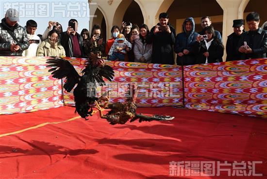 2023年11月18日,游客在艾丁湖景区观看斗鸡表演。