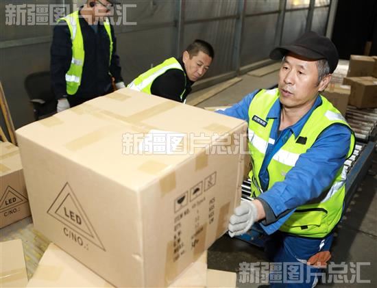 2023年11月18日,工作人员在乌鲁木齐地窝堡国际机场国际货运部装运货物。