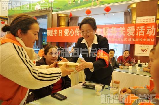 2023年11月17日,博尔塔拉大酒店工作人员给环卫工人端上爱心午餐。