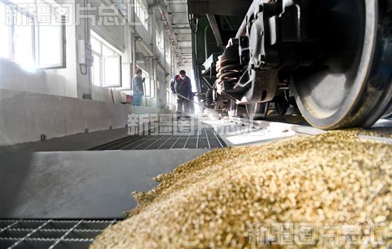 2023年11月3日,阿拉山口综合保税区粮食现代物流中心员工在铁路换装线上卸粮。