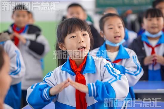 2023年11月16日,昌吉市第二小学学生在大课间上做室内手势操。
