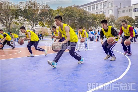 2023年11月15日,昌吉市第一中学学生在大课间上练习篮球。