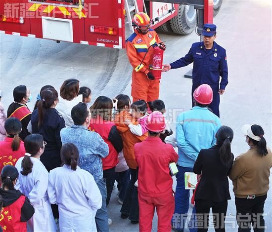 2023年11月3日,救援大队人员在介绍灭火器的使用方法。