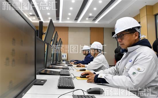 2023年11月4日,工作人员在阿拉山口综保区油气换装线综合调度指挥中心远程监控植物油灌装情况。