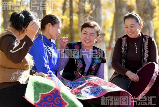 2023年11月5日,牧民新村“哈萨克刺绣培训”绣娘在一起制作刺绣产品。