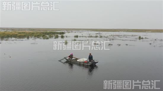 2023年11月7日,乌苏市石桥乡天鹅湖水产养殖基地渔民捕捞水产品。(无人机摄)