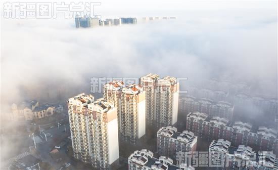 2023年11月21日,雨雪过后的昌吉市城区出现了平流雾自然现象,城区被雾气环绕仿佛披上了一层薄纱,钢筋混凝土组成的楼宇之间,缥缈的云层如丝带般轻柔地拂过。云雾与城市交叠在一起,仿佛一座“天空之城”。