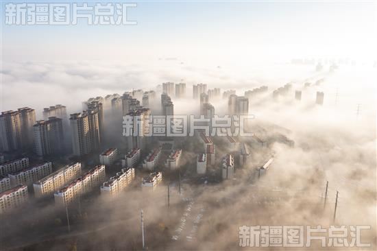 2023年11月21日,雨雪过后的昌吉市城区出现了平流雾自然现象,城区被雾气环绕仿佛披上了一层薄纱,钢筋混凝土组成的楼宇之间,缥缈的云层如丝带般轻柔地拂过。云雾与城市交叠在一起,仿佛一座“天空之城”。