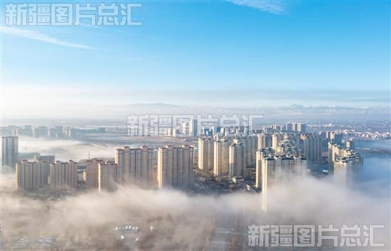 2023年11月21日,雨雪过后的昌吉市城区出现了平流雾自然现象,城区被雾气环绕仿佛披上了一层薄纱,钢筋混凝土组成的楼宇之间,缥缈的云层如丝带般轻柔地拂过。云雾与城市交叠在一起,仿佛一座“天空之城”。