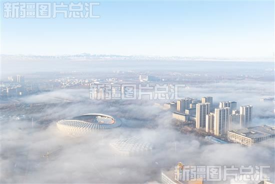 2023年11月21日,雨雪过后的昌吉市城区出现了平流雾自然现象,城区被雾气环绕仿佛披上了一层薄纱,钢筋混凝土组成的楼宇之间,缥缈的云层如丝带般轻柔地拂过。云雾与城市交叠在一起,仿佛一座“天空之城”。