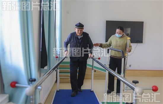 2023年11月20日,新源县阿勒玛勒镇医养结合服务中心工作人员人员帮助老人做康复训练。