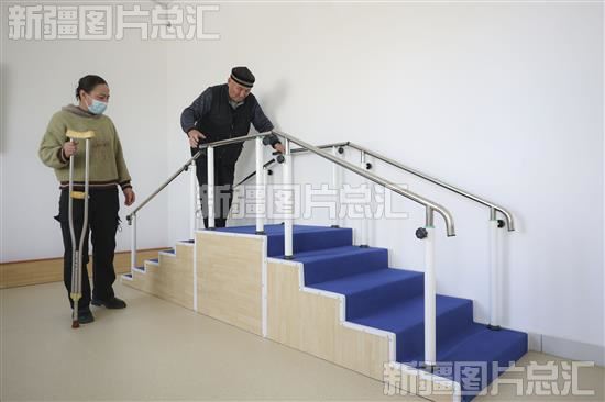 2023年11月20日,新源县阿勒玛勒镇医养结合服务中心工作人员人员帮助老人做康复训练。