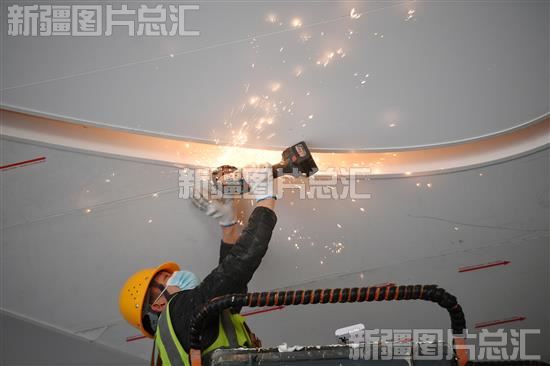 2023年11月7日,工作人员在乌鲁木齐国际机场改扩建工程航站楼内施工。
