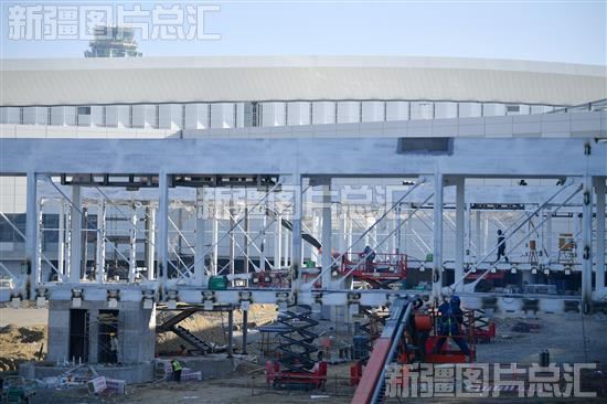 2023年11月7日,工作人员在乌鲁木齐国际机场改扩建工程航站楼指廊外施工。