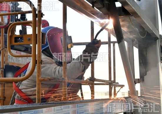 2023年11月7日,工作人员在乌鲁木齐国际机场改扩建工程航站楼指廊外施工。