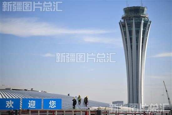 2023年11月7日,工作人员在乌鲁木齐国际机场改扩建工程航站楼外施工。