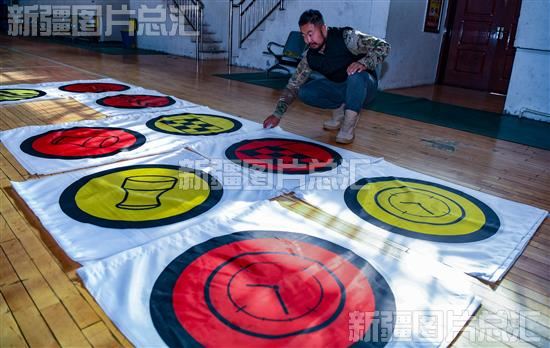 2023年11月9日,在伊犁地区霍城县体育馆,一名工作人员正在整理2023年中国环塔(伊犁)分站赛的信号旗。