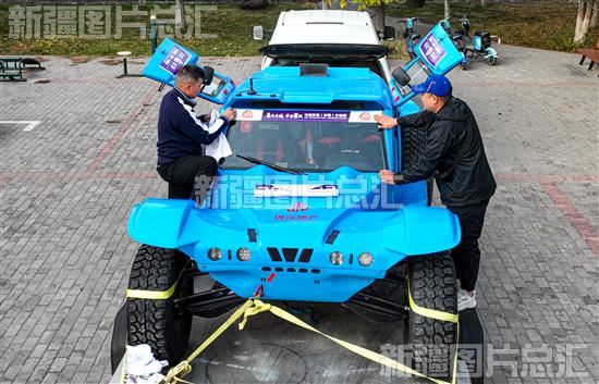 2023年11月9日,在伊犁地区霍城县体育馆,两名来自河南省的参赛选手正在为参赛车辆贴车贴。