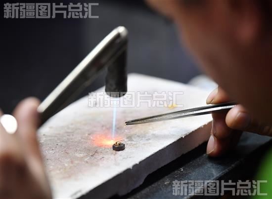 2023年11月20日,工作人员在新疆丝路玉海珠宝有限公司加工制作黄金首饰。