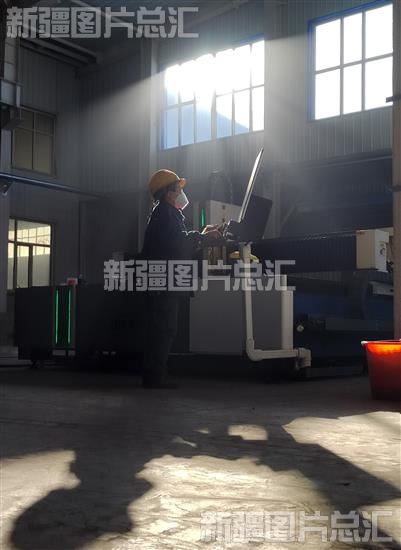 2023年11月8日,工作人员在新疆华通泰克游乐设备有限公司生产车间使用激光切割机切割零件。