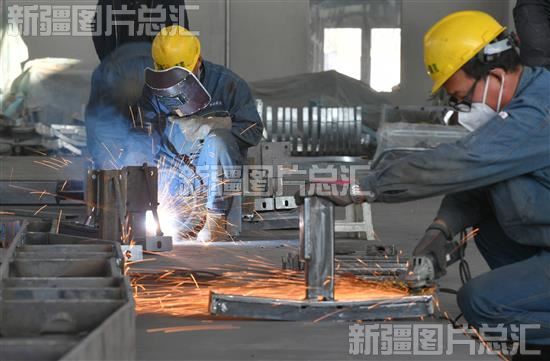 2023年11月8日,工作人员在新疆华通泰克游乐设备有限公司生产车间焊接零件。