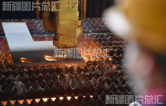 2023年11月8日,工作人员在新疆华通泰克游乐设备有限公司生产车间使用激光切割机切割零件。
