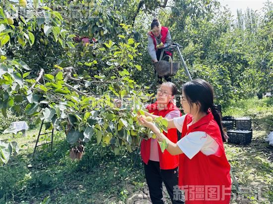 眼下,正值香梨采摘时节,阿克苏市水利局驻喀拉塔勒镇萨提村“访惠聚”工作队组织工作队员、村干部和党团员志愿者帮助缺少劳动力的果农采摘香梨。